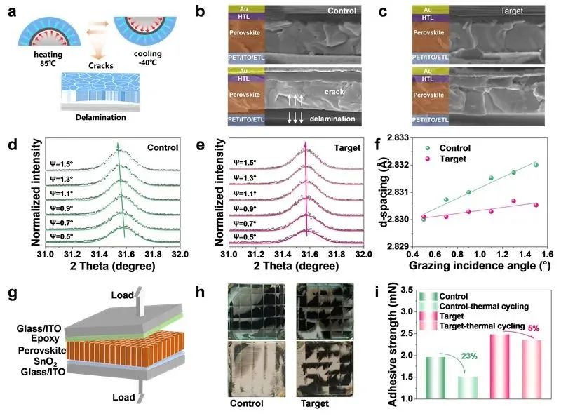 Figure 4. Mechanical and thermal properties of perovskite. (a) Schematic illustration of the strain evolution in a perovskite film during −40 °C to 85 °C thermal cycling. Cross-sectional SEM images of the (b) control and (c) target FPSCs after thermal cycling. Grazing incidence X-ray Diffraction (GIXRD) patterns at different Ψ angles (from 0.5° to 1.5°) for (d) control and (e) target perovskite films after thermal cycling. (f) Lattice spacing d(012) versus sin2(Ψ) plots for control and target perovskite films. (g) Schematic illustration of the delamination process of the perovskite–SnO2 interface. (h) Optical photographs of fracture surface (SnO2 ETL top side and perovskite bottom side) after delamination for control and target sample. (i) Adhesion strength of control and target perovskite film before and after thermal cycling.