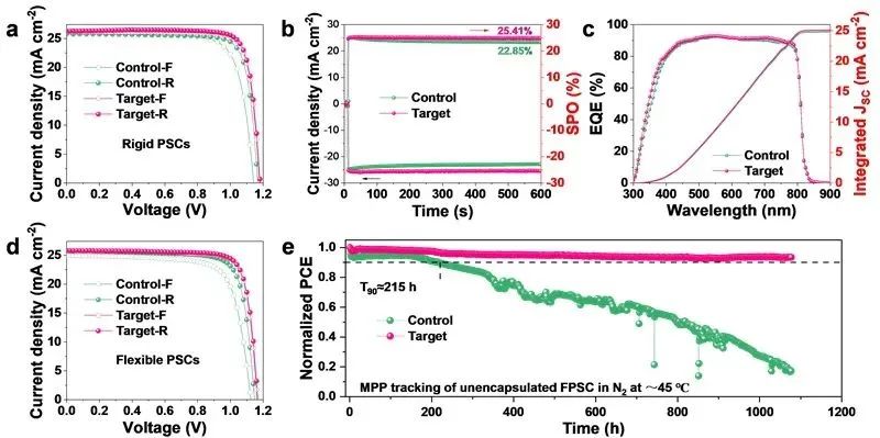 最终,AMPS-DEA改性的钙钛矿太阳能电池在刚性基底上实现了25.78%的光电转换效率,在柔性基底上提高到24.54%的光电转换效率,这主要得益于器件开路电压(VOC)和填充因子(FF)的改善。另外,在最大功率点(MPP)下,AMPS-DEA修饰的FPSC在1000小时后保持了90%的初始效率,这种出色的长期稳定性归因于AMPS-DEA对晶界和界面的全面钝化。