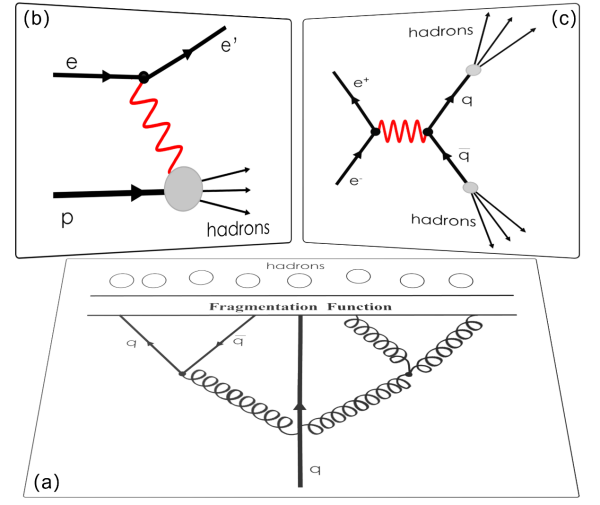 (a)部分子碎裂至强子过程示意图,(b)电子-质子半单举深度非弹性散射过程示意图,(c)正负电子湮灭过程示意图。