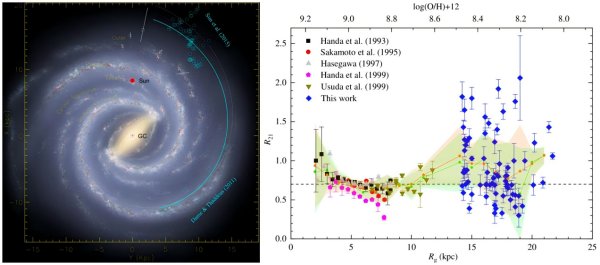 左图为银河系边缘分子云(青色圆圈)分布;右图为R21比值随银心距的变化