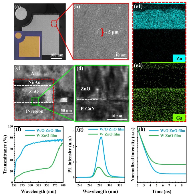 图1 (a) 器件A的SEM俯视及显微照片;(b) 台面区域的SEM放大图;(c) 包含Al/Au/Ni/ZnO层与p型区域的截面STEM图;(d) n-ZnO/p-GaN界面的STEM高倍放大图;(e1) 和 (e2) 分别为Zn元素和Ga元素的EDS面分布图;(f) 有无n-ZnO层的DUV LED晶圆的透过率光谱;(g) 有无n-ZnO层的DUV LED晶圆的光致发光(PL)光谱;(h) 有无n-ZnO层的DUV LED样品的时间分辨光致发光(TRPL)曲线。