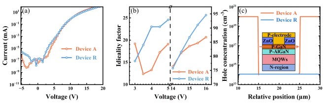 图2 (a) 器件A与R的实测电流-电压特性曲线;(b) 器件A与R的理想因子随注入电流的变化关系;(c) 在20 mA注入电流下,p-GaN层中空穴浓度的计算结果。