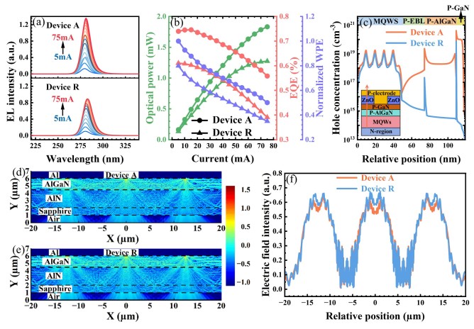 图3 (a) 器件A与R的实测电致发光(EL)光谱;(b) 器件A与R的外量子效率(EQE)、光输出功率及归一化WPE实测结果;(c) 在20 mA注入电流下,器件A与R的有源区及p型区空穴浓度计算分布;(d) 与 (e) 分别为器件A和器件R在TE偏振光下的XY截面电场分布图;(f) 两种器件辐射到空气中的TE偏振光强度一维分布对比。