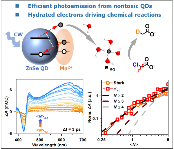 上述研究揭示了锰掺杂ZnSe量子点中的超快自旋交换能量转移和俄歇光发射机制,发展了基于无镉量子点的高效水合电子制备新方法。