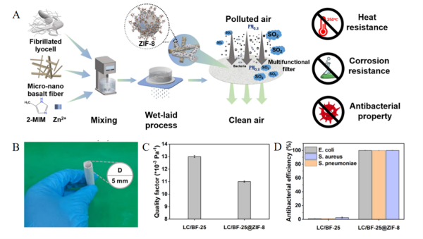 近期,中国科学院新疆理化技术研究所在环保多功能型空气过滤材料研发方面取得进展。团队以莱赛尔纤维和玄武岩纤维为原料,采用湿法成型工艺制备了微纳米复合纤维滤材。该滤材具有良好的柔性与可加工性,与纯纤维素纤维滤材相比,通过与玄武岩纤维复合,其破裂强度和撕裂强度均有显著提升。科研人员进一步通过在复合滤材表面原位生长沸石咪唑酯骨架(ZIF-8),赋予其优异的空气净化和抗菌性能,滤材对PM0.3的过滤效率达到97.72%。ZIF-8表面功能化显著提升了滤材对有害气体的吸附性能,SO2吸附量提升约93%,甲苯吸附量提升约111.5%,表现出协同捕获颗粒物与有害气体的能力。玄武岩纤维赋予滤材优异的耐热性,在250 °C下可维持稳定的过滤性能。此外,负载的ZIF-8能够释放Zn2+离子,使滤材具有广谱抗菌能力,对大肠杆菌、金黄色葡萄球菌和肺炎链球菌等抗菌率均超过99.8%,还展现出良好的抗真菌效果。由于复合滤材的制备基于天然生物质及矿物纤维,并采用无粘合剂工艺,因此其具有良好的降解特性,土壤掩埋21天后,滤材质量损失率达32.2%。