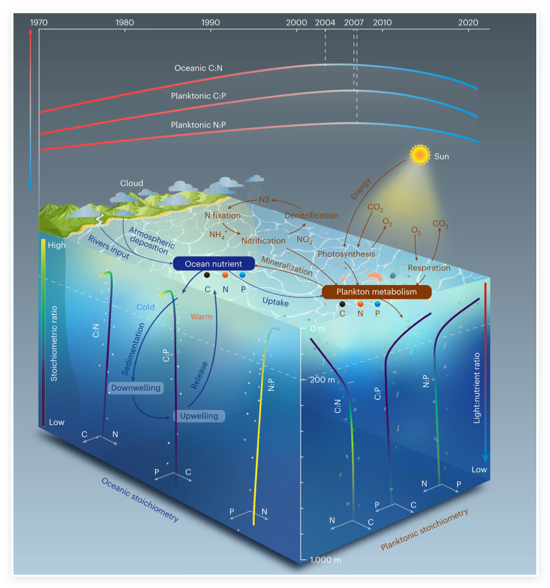 研究人员通过对这些数据系统分析发现,海洋中C:N、C:P及N:P比值正以可检测的速率偏离传统假设,并呈现明显的区域性与垂向结构特征。研究人员指出,浮游生物中C:P和N:P比值在全球范围内普遍升高,这表明海洋生态系统面临更广泛的磷限制,而海水中C:N和C:P比值上升意味着表层海洋的碳富集趋势愈发显著。同时,时间序列分析表明,浮游生物的C:N与N:P比值在20世纪末显著上升,但在2007年前后出现转折趋势,开始缓慢下降。这可能与近年来全球范围内农业活动、城市污水及工业排放导致的磷输入增加有关,继而缓解了部分区域的磷限制,并引发浮游生物群落结构变化。