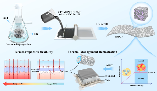中国科学院青海盐湖研究所研究团队以三水醋酸钠为相变材料,通过多孔膨胀石墨构建封装空间,设计了无机相变薄膜。研究通过膨胀石墨在不同方向层间交联形成3D多孔支撑骨架构建“热桥”,实现了热量多维度传递。当电子器件临界热失控,相变薄膜主动储存热量,“热传导+热吸收”双重热管理机制可缓冲电子器件瞬时热通量,同时PVDF的引入使相变薄膜获得热诱导柔性、良好的阻燃与电绝缘性能。这一工作使热失控电池模块温度降低10 ℃,CPU表面温度降低20 ℃。