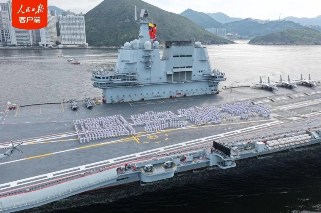 7月3日,中国海军山东舰航母编队抵达香港,山东舰官兵在甲板排出“国安家好”字样。图源:人民日报客户端