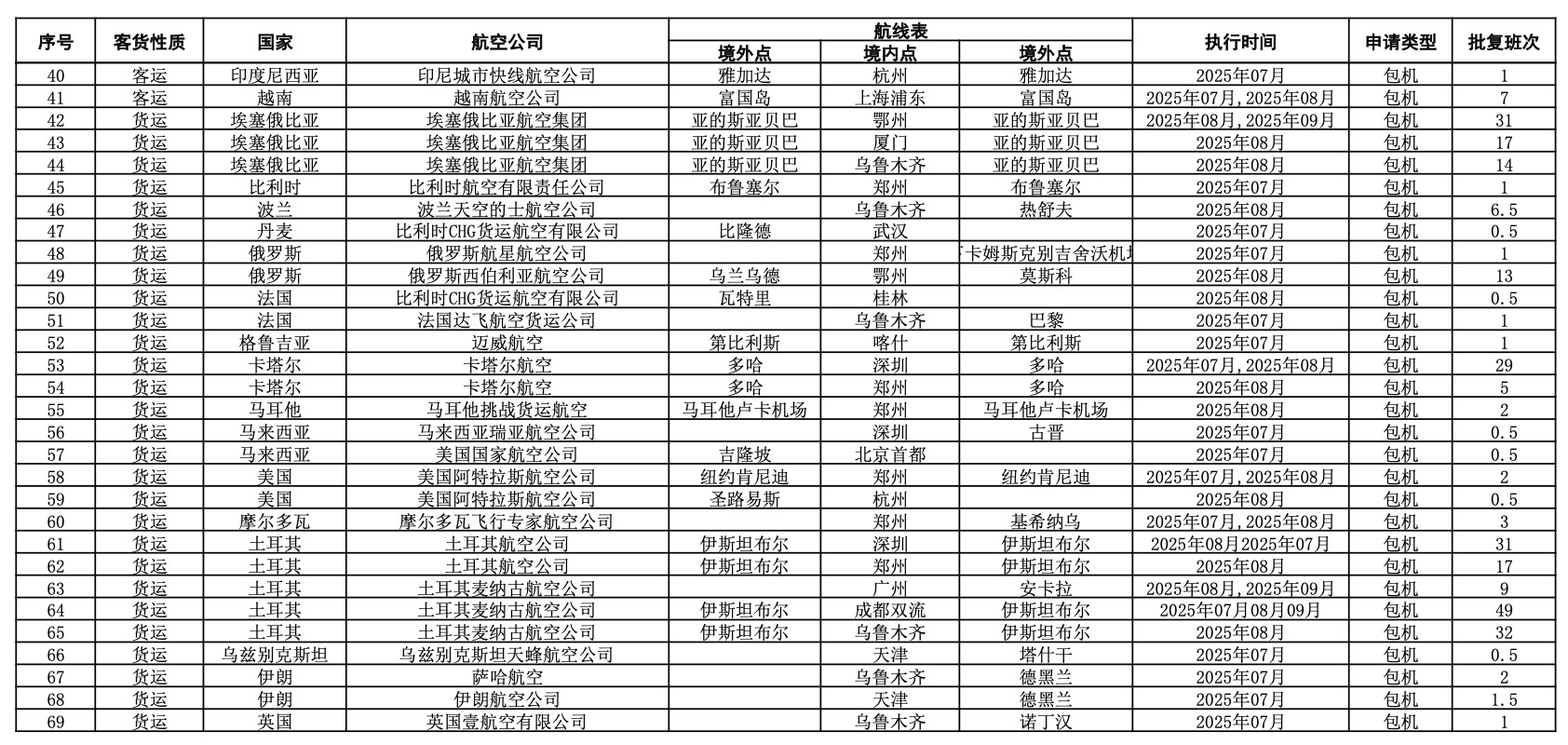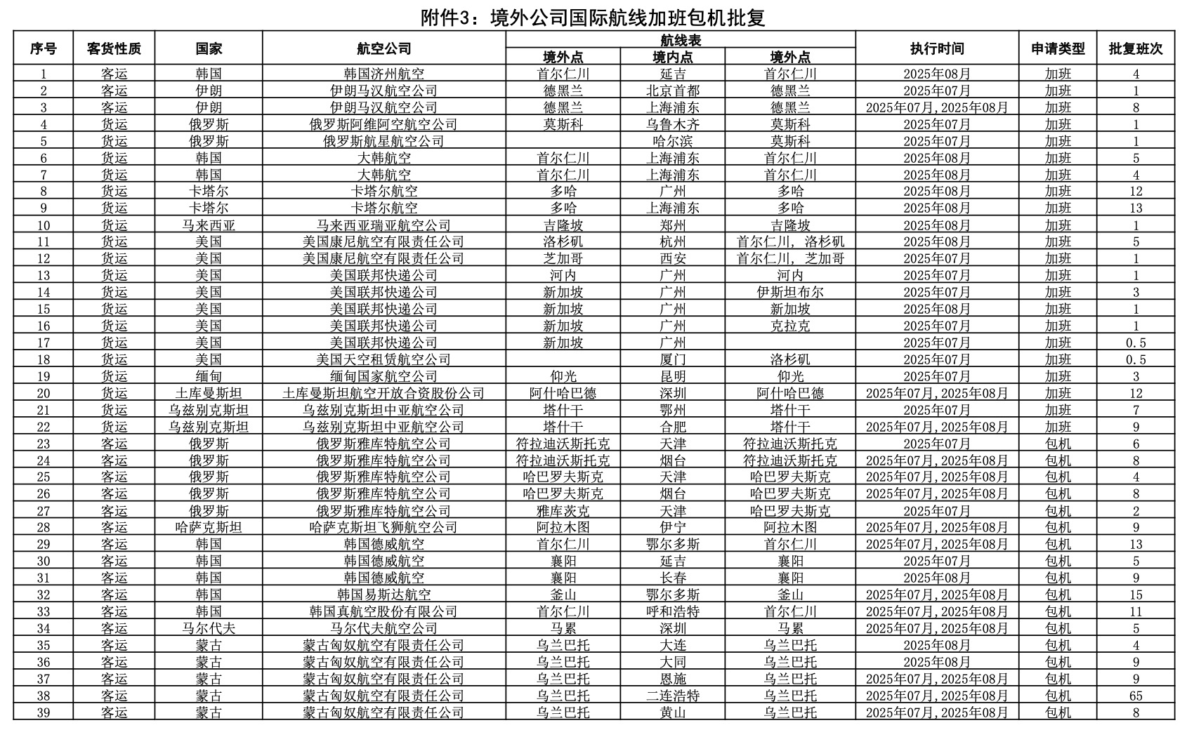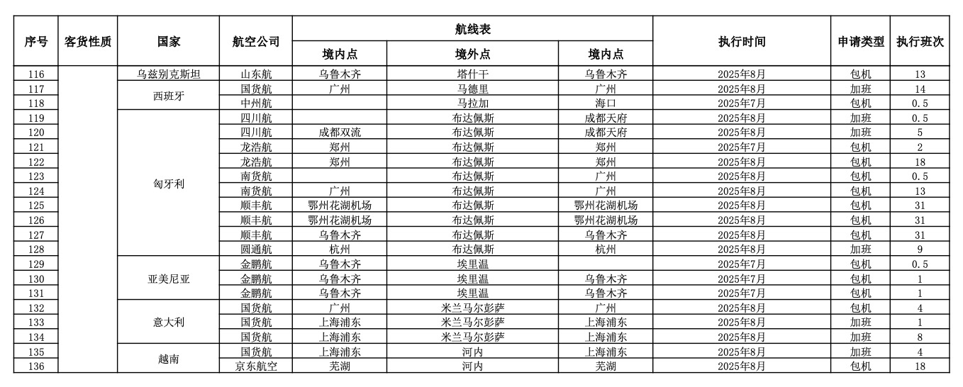 民航局公布2025年7月国际航线临时加班和包机审批情况。