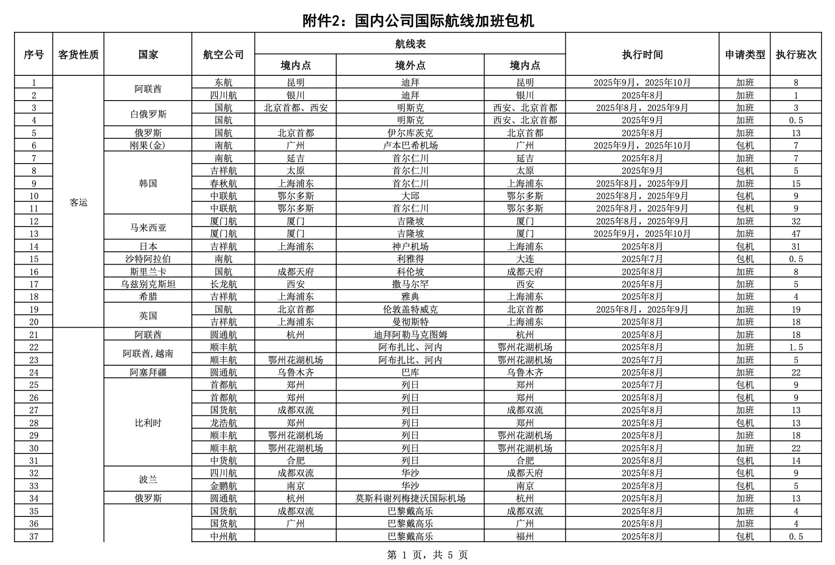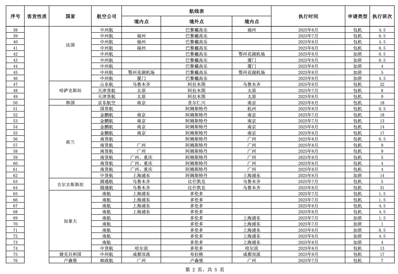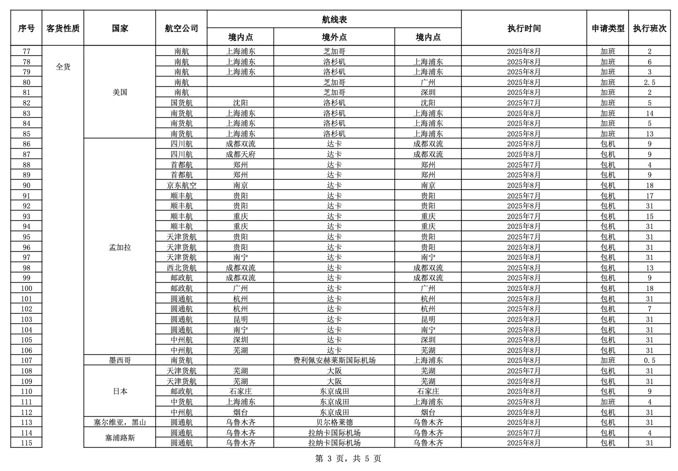 民航局公布2025年7月国际航线临时加班和包机审批情况。