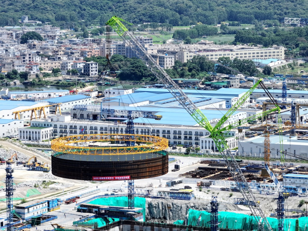 军工资源网 2025年09月04日4号机组钢衬里模块四内径46.8米,整体高度9.96米,就位标高约19.96米,起吊总重量约221吨,包括钢衬里筒体6段和7段、贯穿和非贯穿锚固件等物项。