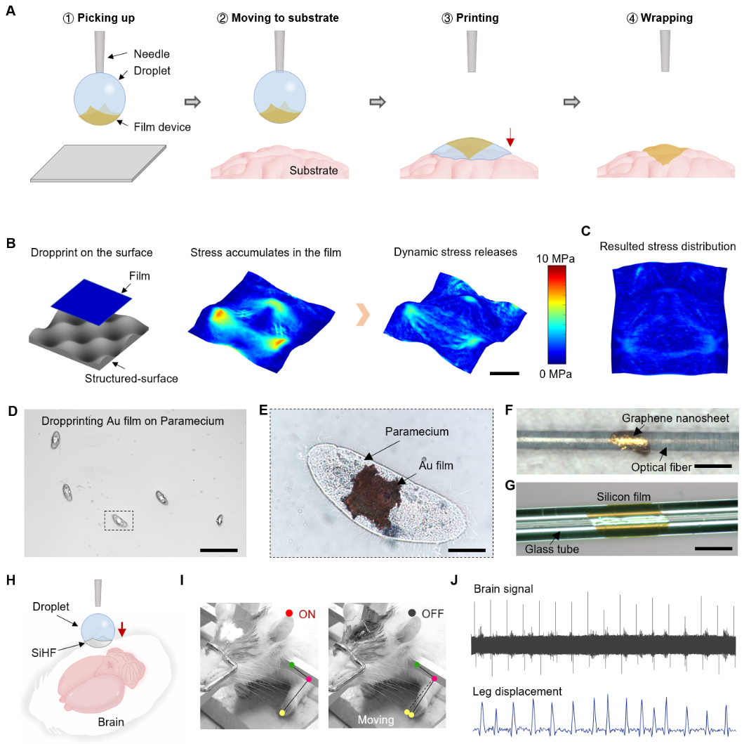 液滴打印实现薄膜的无应力保形贴附。(A)液滴打印的实施过程;(B)薄膜的动态应力释放过程;(C)薄膜中的应力分布;(D-E)在草履虫上打印的金薄膜;(F)打印在光纤上的石墨烯纳米片;(G)打印在玻璃管上的硅膜;(H-J)通过液滴打印在大鼠模型中构筑的“脑机接口”。
