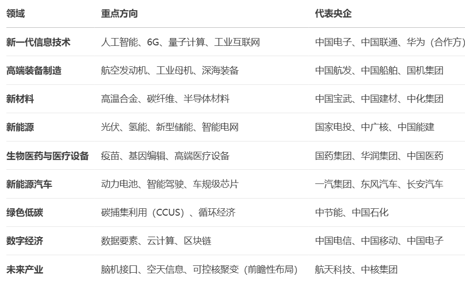 中央企业是发展战略性新兴产业的主力军。国务院国资委多次强调,央企要加快布局新赛道、培育新动能,在关键领域和未来产业中占据主导地位。明确要求中央企业要加大新一代信息技术、人工智能、生物技术、新能源、新材料等布局力度,强化航空航天、轨道交通、海洋工程、智能装备等高端制造业布局,在10个以上重点领域形成全球领先的产业集群。