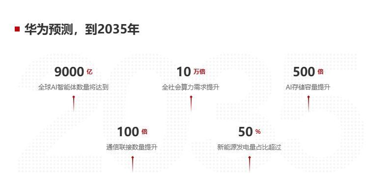 报告指出,人工智能的飞速发展,必将重塑现有的开发范式,改变人机交互模式,并催生更多新应用。华为预测,到2035年,全球AI智能体数量将达到9000亿,AI存储容量将提升500倍,通信联接数量将提升100倍,新能源发电量占比将超过50%。