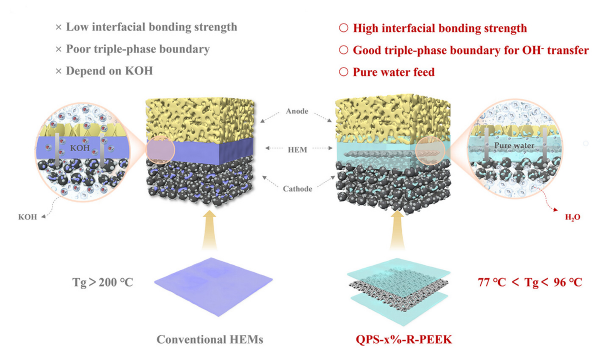 研究团队以机械性能优异的聚醚醚酮为基膜,引入低玻璃化温度的季铵化聚苯乙烯(QPS)作为树脂,研制出新型AEM复合膜。QPS材料在热压工艺及电池运行中,可从玻璃态转为高弹态,起到类似“胶水”的作用,增强了膜-电极界面的结合强度,并促进氢氧根(OH-)的高效传输。