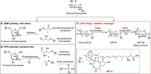 军工资源网 2025年09月28日糖类是细胞能量的主要来源,也是构成细胞结构的重要组成部分。其中,以己糖为代表的分子通过碳-碳键断裂生成短链化合物,是其进入代谢网络并执行生理功能的重要途径。通常,在初级代谢中,己糖的裂解反应通过己酮糖的反向醛缩或类转酮机制实现。但是,在化学多样性极为丰富的次级代谢领域,己糖裂解反应却鲜有报道。