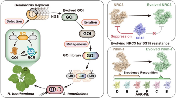 近日,中国科学院遗传与发育生物学研究所高彩霞团队与微生物研究所邱金龙团队合作,对双生病毒复制子进行工程化改造,首次在植物底盘中构建了快速且通用的体内定向进化系统GRAPE,并利用该系统实现了植物免疫受体NRC3和Pikm-1的体内定向进化,为植物基因和蛋白的工程化改造提供了性能强大的高通量技术平台。