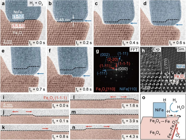 团队通过氢气部分还原NiFe2O4前驱体,制备得到NiFe–Fe3O4催化剂。在氧氢比1:10、温度超500℃的反应条件下,ETEM技术观测到NiFe纳米颗粒在Fe3O4载体上定向迁移,载体发生界面刻蚀与表面重构,界面迁移速率与催化活性直接相关。LMSI机制为:NiFe纳米颗粒活化氢气产生H原子,载体晶格氧反向溢流与之反应,引发界面迁移与Fe3O4还原;被还原的Fe原子迁移至载体{111}表面与氧气反应实现再氧化。