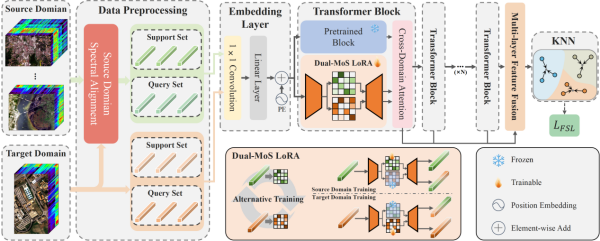 针对上述问题,中国科学院西安光学精密机械研究所团队,创新性地提出了一种基于视觉大模型的高光谱少样本分类框架SpectralDINO。该框架通过源域光谱对齐模块统一各数据域的光谱信息,增强模型学习跨域通用特征能力。团队同时设计了一种新型低秩适应(LoRA)模块,并使用交替训练策略对视觉大模型进行微调,通过双混合子空间的设计,解决了原始LoRA无法区分跨域数据的结构性问题。