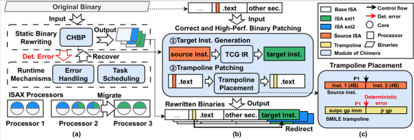 针对上述问题,研究团队设计出基于软硬件协同设计的RISC-V异构计算系统Chimera。该系统基于二进制重写方法,利用RISC-V指令集的编码特性,使可能出现的运行错误具备确定性与可恢复性,并借助轻量级机制实现安全恢复。相比于现有基于二进制重写方法设计的系统,新系统错误恢复机制的触发频率整体降低4个数量级,在无需源代码的情况下,实现了异构RISC-V处理器核心间高效、透明且正确性有保障的任务迁移与调度。
