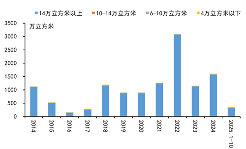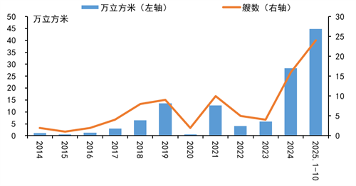 LNG运输船订单下滑源于出口项目决策有限、运费低迷与运力增长压力。2025年,达成最终投资决定的LNG出口项目数量有限,直接抑制LNG运输船的新造需求。且由于近两年新船集中交付,市场运力过剩导致即期运费承压,进一步抑制了新船订单。2025年1-10月,16万立方米、17.4万立方米LNG运输船的平均即期运费分别为16494、27886美元/天,分别同比下降65.5%、53.7%;一年期期租租金分别为19659、35182美元/天,分别同比下降67.3%、53.7%。