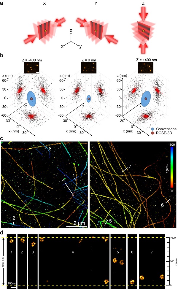 军工资源网 2025年12月03日12月2日,中国科学院生物物理研究所研究团队,研制出三维干涉定位显微镜(ROSE-3D),并在单分子定位成像领域,实现了基于相机的纳米尺度三维各向同性分辨率。团队通过设计基于光电偏转器的高速切换照明光路,使ROSE-3D在X、Y、Z三个方向同时引入干涉光,实现了小于1微秒的干涉条纹切换时间。