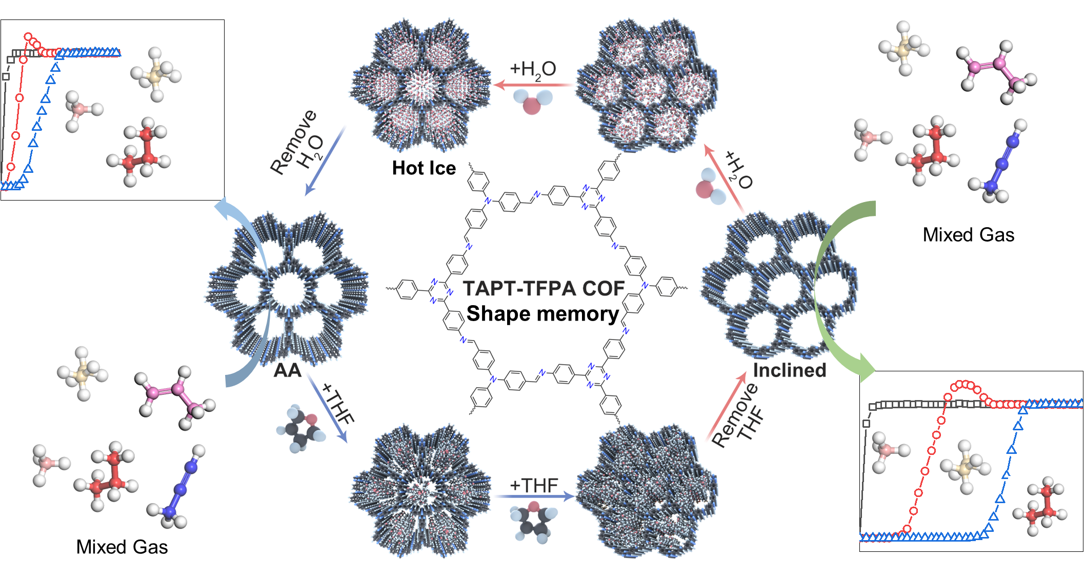 借助该可逆滑移结构及可调孔道,研究进一步展示了甲烷—乙烷—丙烷,以及丙烯—丙炔动态智能气体分离的应用潜力。该策略为2D COF层间滑移调控、纳米限域相变及高效气体分离提供了新思路。
