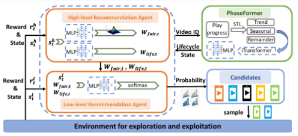 针对这一问题,研究团队提出数字内容生命周期感知的分层强化学习框架(LHRL),实现了对推荐系统“短期用户满意度”与“长期生态公平性”的动态平衡。实验结果显示,该机制可在保持用户满意度的同时,将长期用户参与度提升超过10%,显著改善了内容分布公平性。该研究揭示了生命周期因素在推荐公平性调控中的关键作用,为构建可持续、公平、可信的推荐生态提供了新的决策范式。