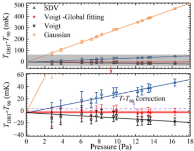 实验结果显示,DBT测温值与标准铂电阻温度计的偏差仅为-2.0±3.6mK,统计不确定度7ppm,系统不确定度9ppm,将系统不确定度控制在10ppm以内。即使采用不同的线型模型进行分析,压力外推后结果都呈现出良好的一致性,表明该方法摆脱了对线型模型的依赖。