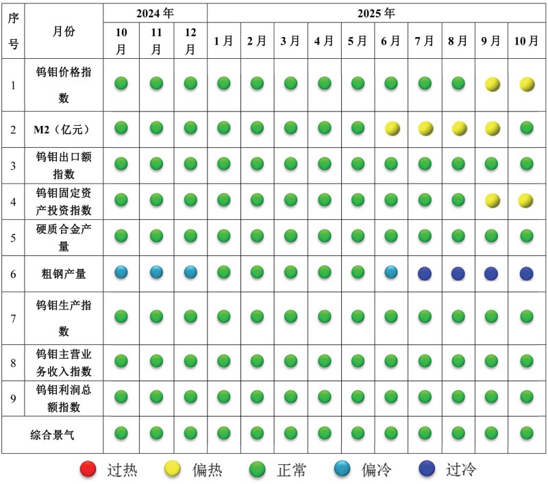 2025年10月,先行指数为50.1,较9月下降1.4个百分点,表明钨钼产业短期增长预期微降。在先行合成指数的6个指标中,3项指标位于“正常”区间,钨钼价格指数及钨钼固定资产投资指数2项指标位于“偏热”区间,粗钢指数位于“过冷”区间。