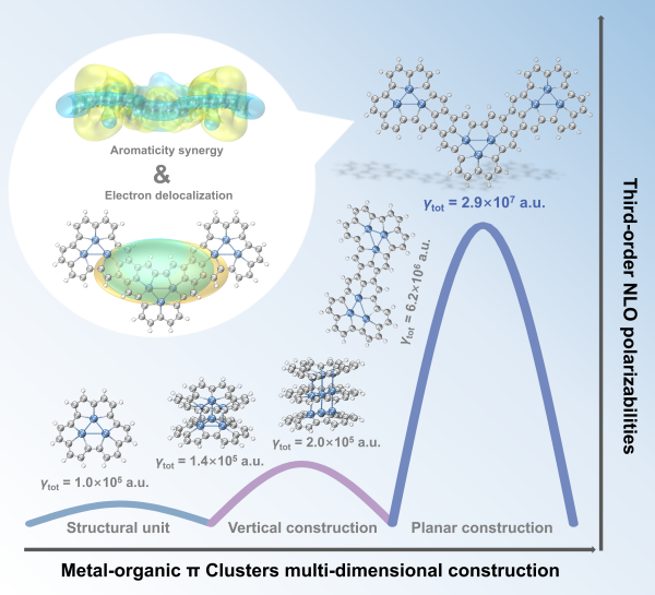 近日,中国科学院福建物质结构研究所等提出一种组装策略:以锇金属杂戊搭炔片段为基础单元,组装出Os3—plane团簇为结构基元,并通过两种组装方式构建出4种高阶结构。水平组装:通过C—C共价键连接,构建平面波浪形扩展结构。垂直组装:通过Os—Os金属间相互作用堆叠,形成棱柱状立体结构;其轨道组成、多中心成键特性及芳香特性表明5个团簇的配体与簇芯均具有离域π轨道和芳香性,属于典型的金属—有机π团簇。每种结构表现出增强的三阶非线性光学性能,其中Os9—plane的三阶非线性光学响应系数比Os3—plane高出两个数量级。