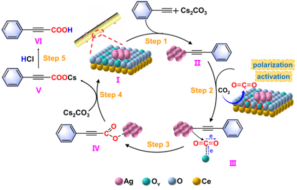 团队发现,在Cs2CO3的协助下,苯乙炔中的酸性C(sp)-H键被去质子化,形成末端炔基阴离子,同时与银簇(Ag+)配位,生成银炔中间体;CO2在CeO2表面的Ov位点上吸附并发生极化,活化的CO2插入到C≡C---Ag键中,生成羧酸银中间体,随后用盐酸酸化获得产物苯丙炔酸。