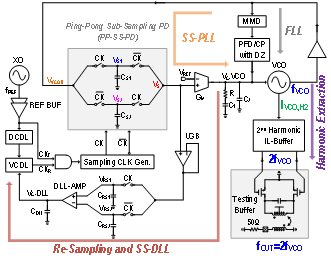 中国科学院微电子研究所与清华大学合作,提出双边沿乒乓亚采样锁相环架构。该架构同时利用参考时钟的上升沿与下降沿,实现了参考频率的等效倍频,解决了传统亚采样锁相环在环路带宽、带内相位噪声与参考杂散之间存在的设计折衷难题。团队还提出高功率与面积效率的注入锁定缓冲器方案,该结构在高效提取振荡器二次谐波的同时能够实现谐波整形,降低了锁相环带外相位噪声。