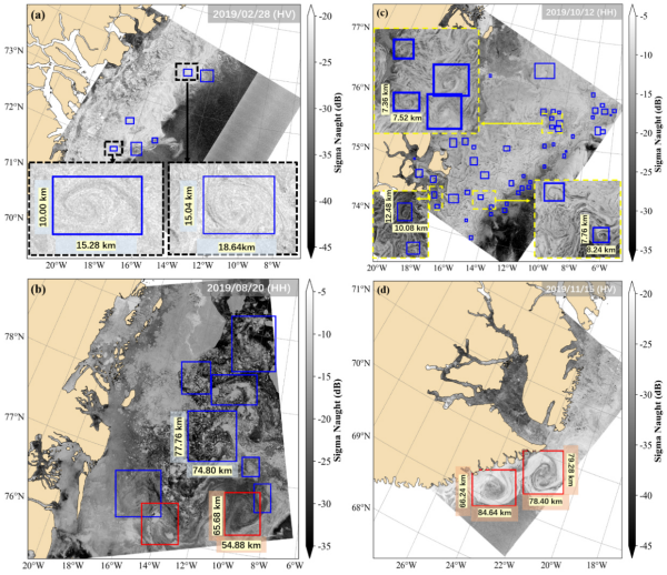 研究将模型应用于2018年—2023年东格陵兰海冰边缘区Sentinel-1A SAR影像,构建了首个基于单星多年连续、稳定观测的海冰边缘区涡旋数据集,并据此分析了该区域涡旋的时空分布和统计特征,发现涡旋高发区与流场活动强烈区及地形效应显著区密切相关;月平均涡旋数量和尺寸受海冰边缘区季节性演变调控;气旋涡和反气旋涡存在显著的特征不对称,与二者的旋转动力学特征及上覆浮冰的运动响应差异有关。