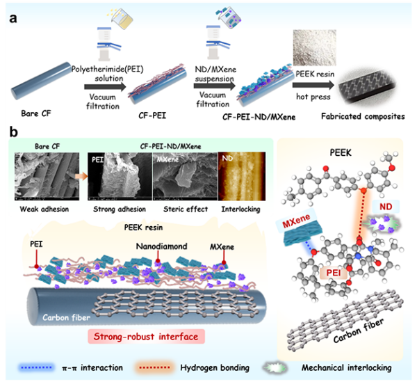 中国科学院兰州化学物理研究所围绕深海环境下聚合物复合材料的损伤机制、组分设计及摩擦学行为开展了系统性研究。近期研究揭示,深海环境对聚合物复合材料的主要损伤形式表现为树脂基体微缺陷的生成与界面层厚度的显著增加。针对深海特异性损伤机理,团队创新性地提出了一种强韧化界面增强策略,采用真空辅助压力渗透技术,在碳纤维织物表面成功构筑了一种“刚—柔”并济的杂化强韧界面结构。该结构以聚醚酰亚胺为柔性相,发挥柔性粘接与应力缓冲作用;以纳米金刚石和二维MXene为刚性相提供物理阻隔与机械互锁点,协同抑制海水渗透扩散、促进应力高效传递。