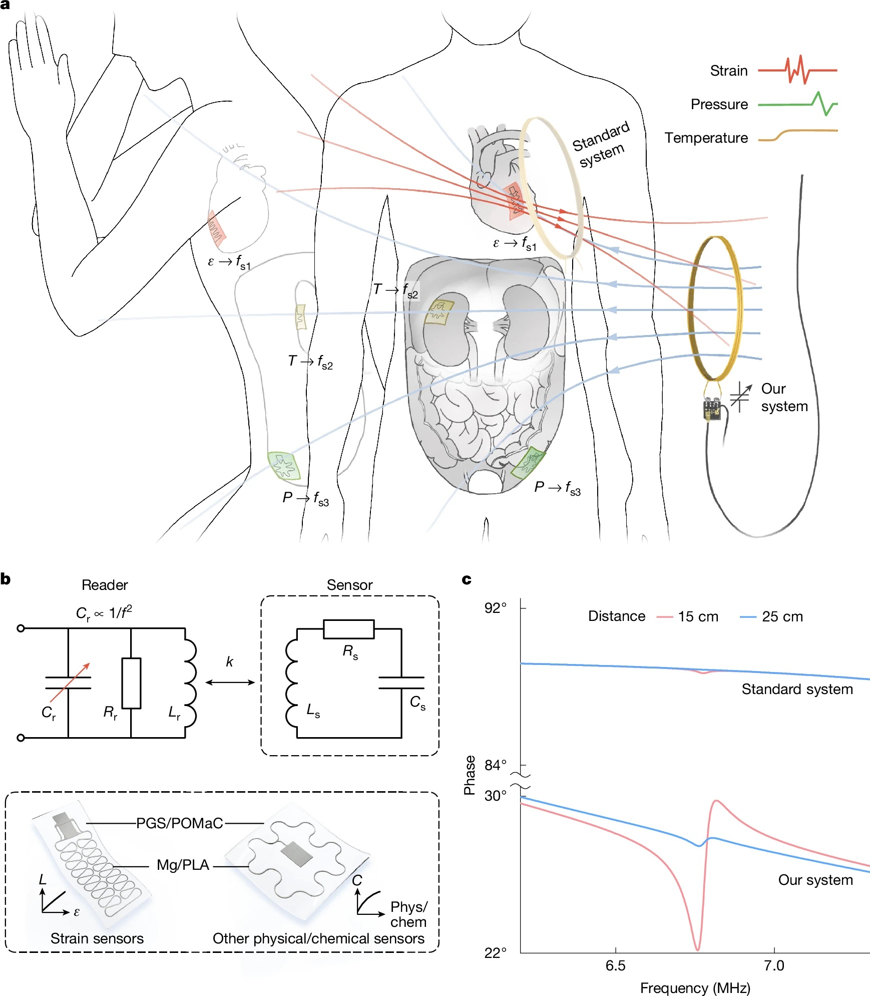 军工资源网 2026年01月09日获取体内临床相关数据对于医疗护理至关重要,现有技术大多依赖体外测量或成像系统,无法充分捕获深层组织的动态变化。植入式器件提供了一种解决方案,但传统设计通常需要电池或磁体,具有潜在风险,同时基于无源电感——电容结构的现有可降解传感器也受限于读取距离短、信号鲁棒性差等问题。