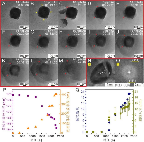 研究团队在排除溶解氧和电子束干扰的前提下,通过原位液相透射电子显微镜等多尺度、多手段联用技术,实时观测了黄铁矿与10ppb(十亿分之十)的极低浓度含金溶液的反应过程。