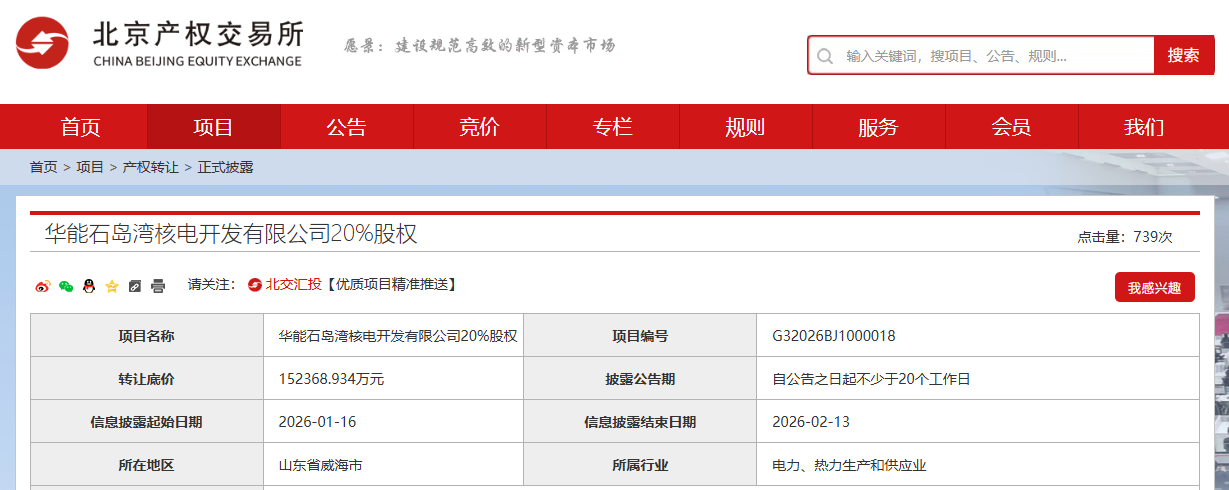 华能石岛湾核电20%股权挂牌转让