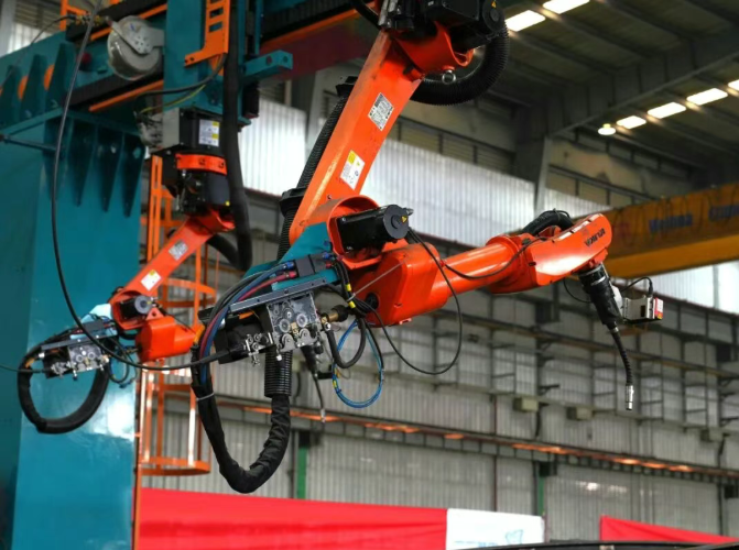 在硬件方面,该工作站通过九轴悬臂焊接机器人与对称双机布局,结合柔性工装自适应技术,实现了三大核心突破:一是高效并行作业——双机器人同步覆盖大型曲面工件的多区域,显著提升焊接效率;二是柔性适配能力强——满足多品种、非标薄壁构件的快速切换;三是在满足复杂结构焊接需求的同时,缩短生产周期并最大化设备利用率。