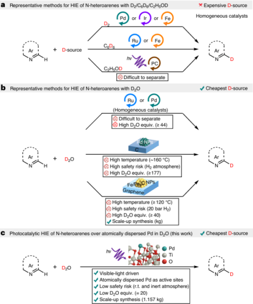研究设计了原子级分散Pd位点的纳米光催化剂,在可见光照射下活化N-杂芳烃的氮邻位C-H键,并与D2O发生氢氘交换反应。与其他催化体系相比,低D2O使用量、可循环使用、宽泛的底物范围和公斤级氘代规模,突出了该纳米光催化系统的先进性。