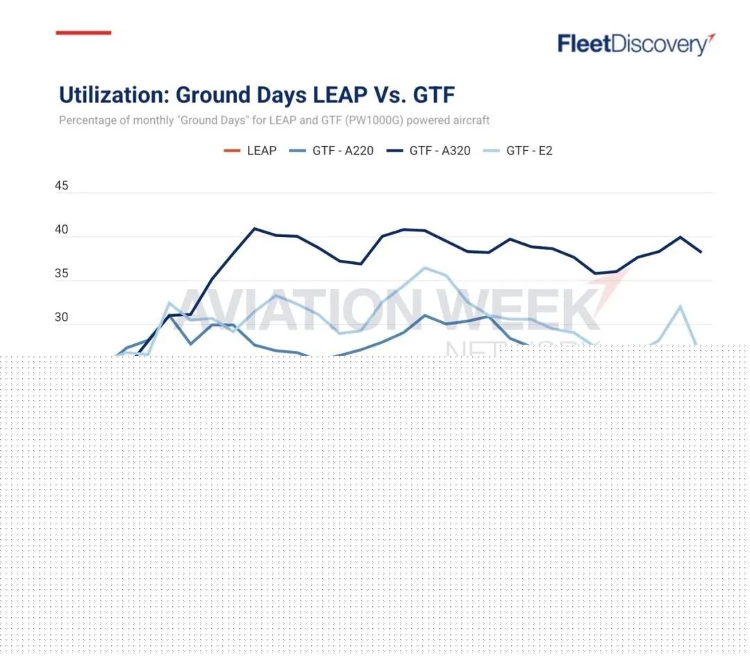 另外以GTF为动力另外两种机型——空客A220和巴航工业E2系列——受到的影响较小,但两者也承受着约25%的地面停场率。作为对比,以CFM国际CFM56为动力的窄体机队在2025年12月的地面停场率为21%,CFM56与IAE V2500一同被视为窄体发动机的行业基准。
