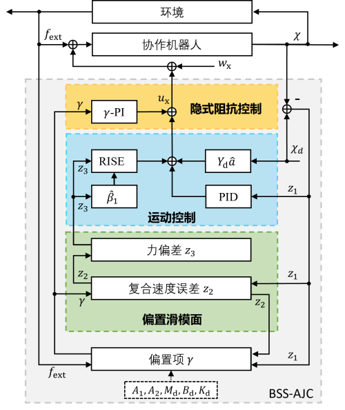 近日,中国科学院宁波材料技术与工程研究所等,提出了基于偏置滑模面的协作机器人自适应跃度控制,解决了低阻尼阻抗渲染需求下的控制稳定性难题。该方法通过接触力反馈和复合运动误差,实时表征力—位耦合特性的动态变化,构建了包含力冲量项的偏置滑模面,从而在欠阻尼的情况下也能准确估计力偏差;利用鲁棒误差积分策略对系统跃度进行调节,实现了力偏差的指数衰减;在此基础上,提出了基于力偏差范数的增益自适应律,实时动态调整滑模增益,抑制了控制信号的抖动,并避免了传统方法中因速度误差与力偏差方向相反导致的系统失稳问题。