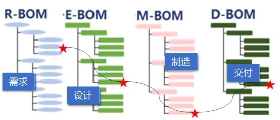 下图中小红星代表了我们要找的零件的一个具体信息,它在不同的业务阶段可能在不同的“树杈”上,但这四棵不同的“树”之间可以通过固定的逻辑进行溯源,因为它们的本质都是产品的分解架构,只是视角不同而已。如此一来,我们要找的目标零件信息就不再是数据海洋中漂流的孤岛,而是被X-BOM这棵大树紧紧串联在一起,不论漂到哪儿,都能找到自己的“前世今生”。
