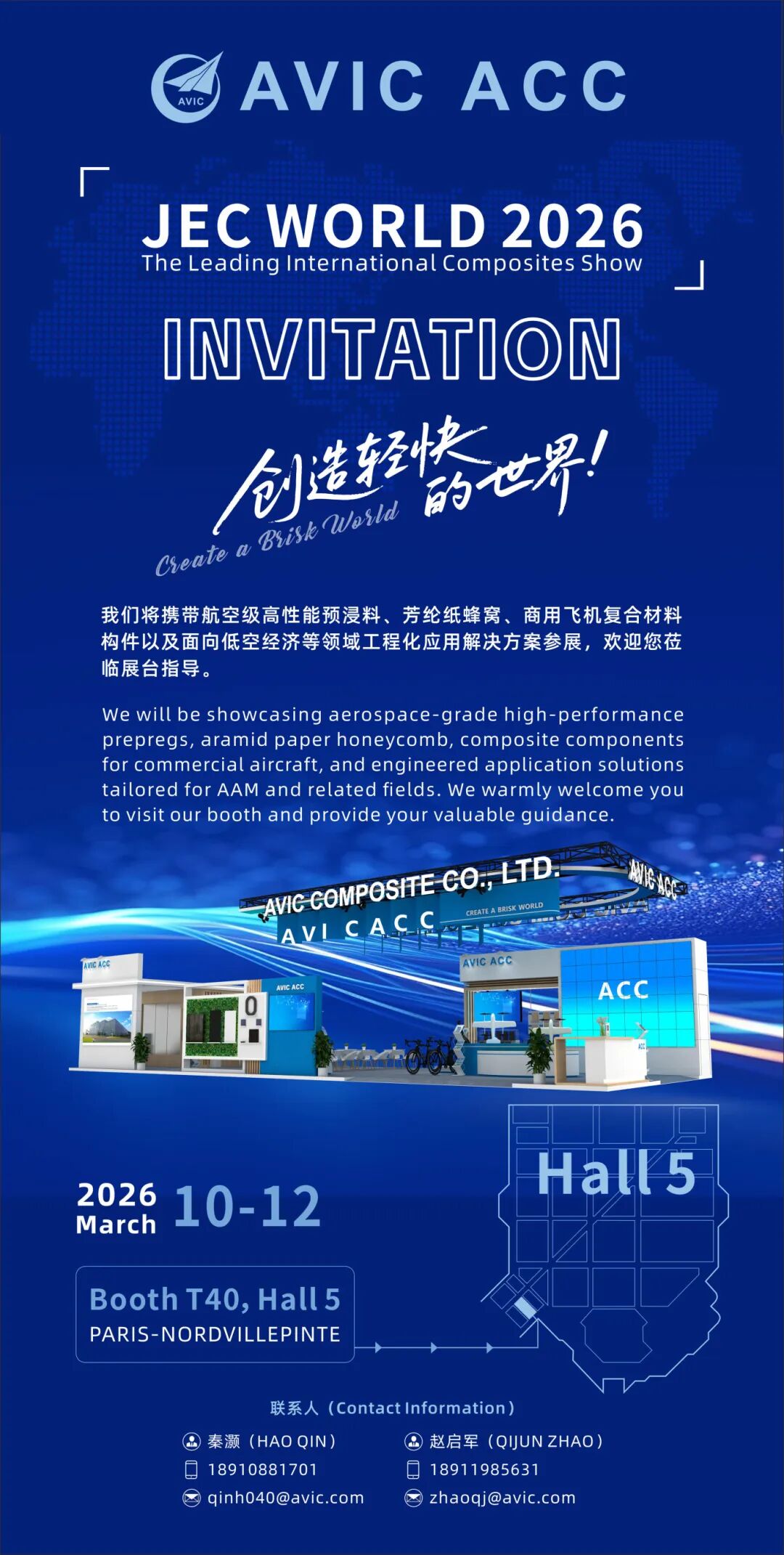 军工资源网 2026年03月05日春意盎然,盛会再启!中航复合材料有限责任公司(以下简称“航空工业复材”)诚挚邀请您莅临法国巴黎JECWorld2026复材展,与我们一同见证先进复合材料的前沿技术与应用突破。