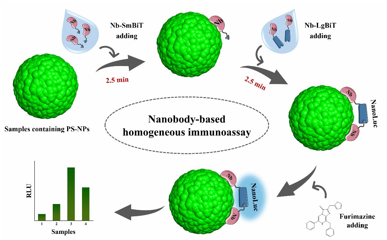 中国科学院青岛生物能源与过程研究所研究团队,依托筛选获得的高亲和力聚苯乙烯结合纳米抗体B2,构建了融合分裂型纳米荧光素酶亚基(SmBiT/LgBiT)的双功能探针,开发出一种基于纳米抗体与分裂荧光素酶技术的均相免疫分析方法,实现对20纳米聚苯乙烯纳米塑料的高灵敏、快速定量检测。