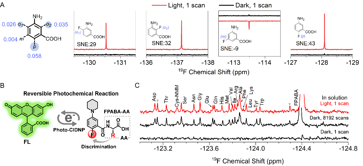 (A)自由基在不同位置处19F的自旋密度及极化性能;(B)19F NMR识别及信号增强机制;(C)1 μM氨基酸混合物的19F NMR谱