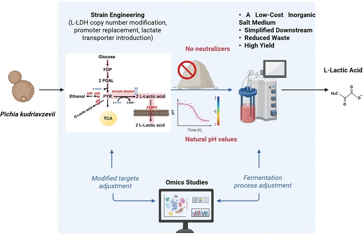 军工资源网 2026年03月10日传统有机酸发酵工艺需添加中和剂,来维持接近中性pH的生产环境,但这会导致后续纯化提取过程中产生大量石膏废渣。此前,为实现有机酸清洁生产,中国科学院微生物研究所研究团队从白酒酿造资源中,筛选获得了具有高鲁棒性的库德里阿兹威氏毕赤酵母。该菌株可在初始葡萄糖浓度>200g/L、pH<3.0的培养环境下快速生长,是实现有机酸发酵的理想底盘细胞。研究团队通过代谢工程改造,研究出无需中和剂的L-乳酸发酵工艺,并系统阐述了非常规酵母在有机酸生物制造领域的应用潜力与发展前景。