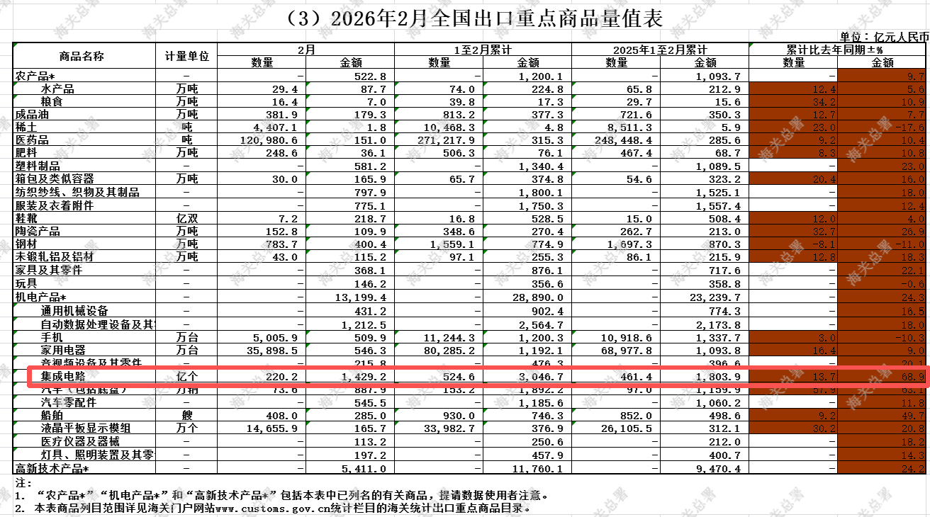尤为亮眼的是,机电产品出口表现突出,前2个月,我国出口机电产品2.89万亿元,同比增长24.3%。其中,集成电路出口额达3046.7亿元,同比增长68.9%。