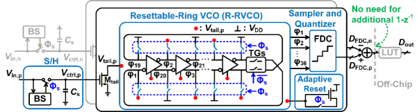 研究团队从理论分析与架构设计入手,建立了统一的行为级模型与噪声分析框架,对多类VCO-based ADC进行等效建模和噪声推导,揭示了制约VCO-based ADC采样速率提升的关键瓶颈。团队据此提出离散时间开环R-RVCO-based ADC结构,通过在压控振荡器内部引入差分传递特性,无需额外微分器即可抑制相位噪声积分效应,同时避免奈奎斯特带内的量化噪声整形,使信噪比提升约3dB。