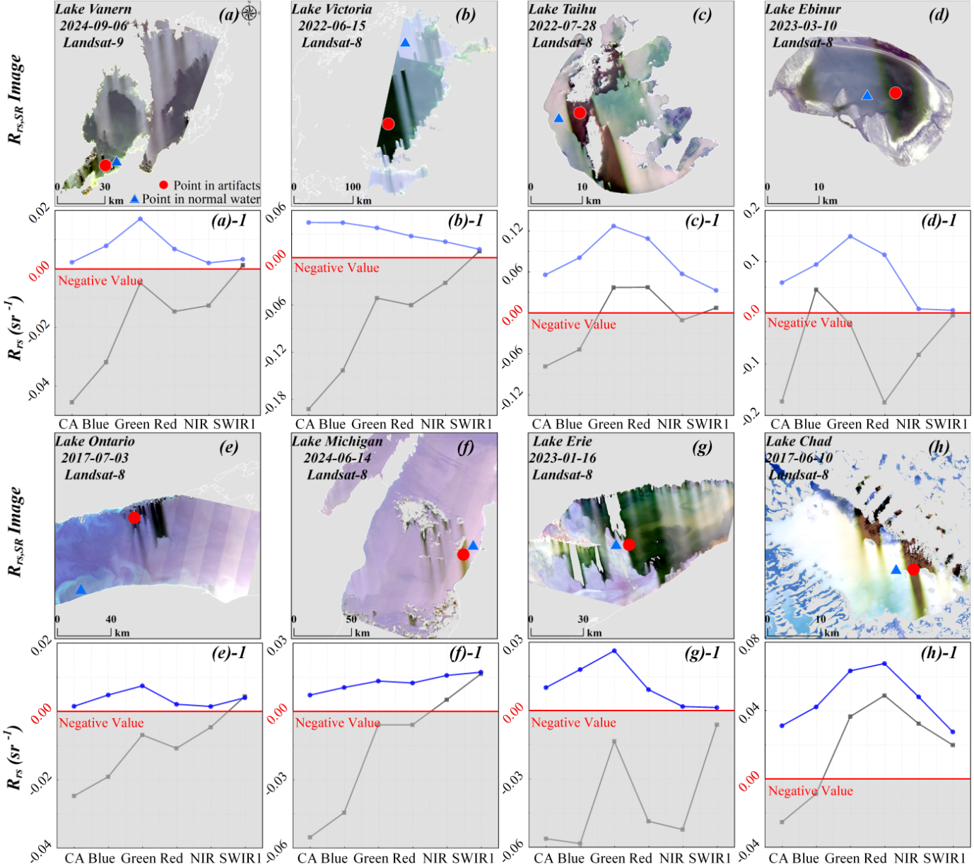 经全球水体遥感影像对比分析,研究团队精准识别出导致观测“视觉误差”的两大关键问题。一是“校正过度”引发的黑色伪影:当水体邻近云、雪等高亮物体时,传统面向陆地设计的“气溶胶校正”算法易出现校正过度,致使影像中出现不合理的“黑色斑块”(伪影),其典型识别标志为443纳米蓝光波段反射率呈现负值。该现象并非个例,全球范围内平均约13%的内陆水体像元受其影响;若直接基于含伪影数据开展分析,悬浮物浓度等关键水质指标的反演误差或可超过100%。另一个关键问题是多代卫星传感器相机色彩不一致导致的数据断层:开展数十年水环境变化分析需整合Landsat‑5/7/8/9 等多代卫星数据,但不同卫星载荷的硬件特性与处理算法存在差异,导致对同一水体的观测结果存在明显偏差,这种观测标准不统一问题增加了长时序水质变化分析的不确定性。